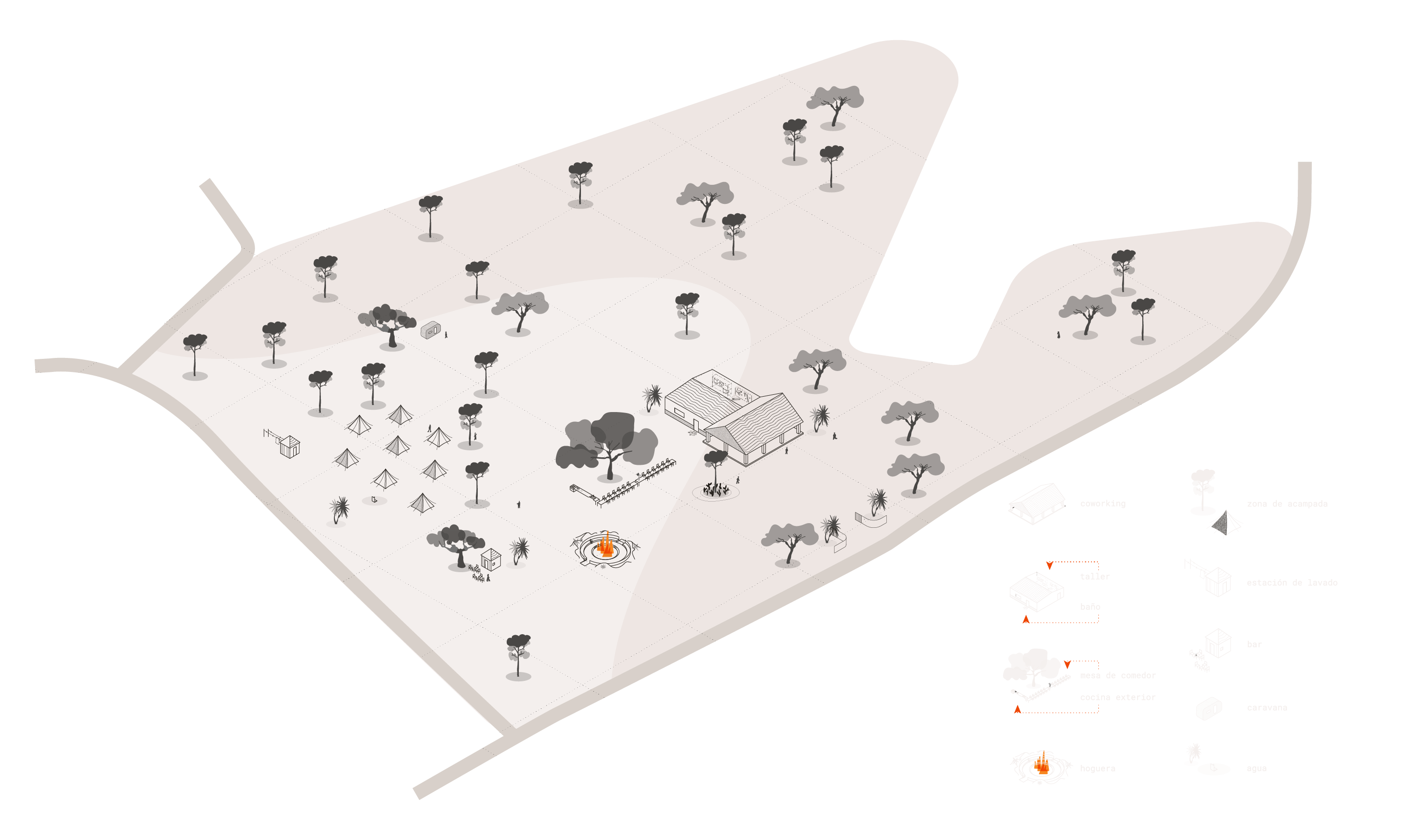 Fuera tienes un mundo sencillo: árboles enormes, pájaros, hoguera, tiendas de campaña, baños cómodos y grandes mesas donde vamos a comer y crear. También montaremos un taller improvisado con herramientas para prototipar con las manos, maderas, y circuitos.